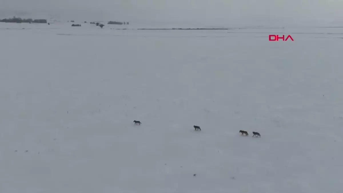 Sivas’ta Dron ile Görüntülenen Kurtlar Karlı Arazide Geziyor